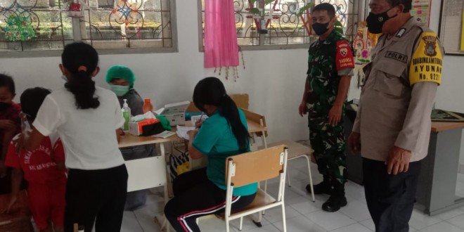 Badung – Dalam rangka mendukung Kegiatan Vaksinasi Covid 19 anak usia 6 – 12 tahun dan memutus penularan Covid-19, Koramil 1611-05/Abiansemal, Babinsa Peltu Agung bersama Bhabinkamtibmas melaksanakan pendampingan kegiatan vaksin tahap I untuk anak sekolah usia 6 — 11 tahun yang dilaksanakan oleh Puskesmas Abiansemal bertempat di SDN 2 Desa Ayunan, Kec.Abiansemal, Kab. Badung Rabu (22/12/2021)