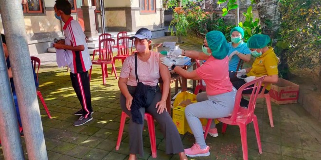 BADUNG – Babinsa Kodim 1611-04/Mengwi Serda Made Gotra bersinergi dengan Bhabinkamtibmas mendampingi petugas kesehatan dalam pelaksanaan vaksin tahap 3 Booster untuk masyarakat umum di Puskesmas Banjar Kangkang Desa Pererenan Kec. Mengwi, Kab. Badung. Sabtu (27/08/22).