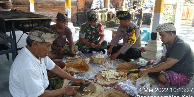Denpasar – Wujudkan kekompakan dalam bermasyarakat Babinsa Koramil 1611-07/Denbar sertu I Gede Wasana dan Bhabinkamtibmas bersama masyarakat melaksanakan kegiatan ngayah dalam rangka piodalan di Pura Dalem Pasek Dangka Br.Pagutan Desa Padangsambian Kaja Denpasar Barat Kota Denpasar. Sabtu (14/05/22)